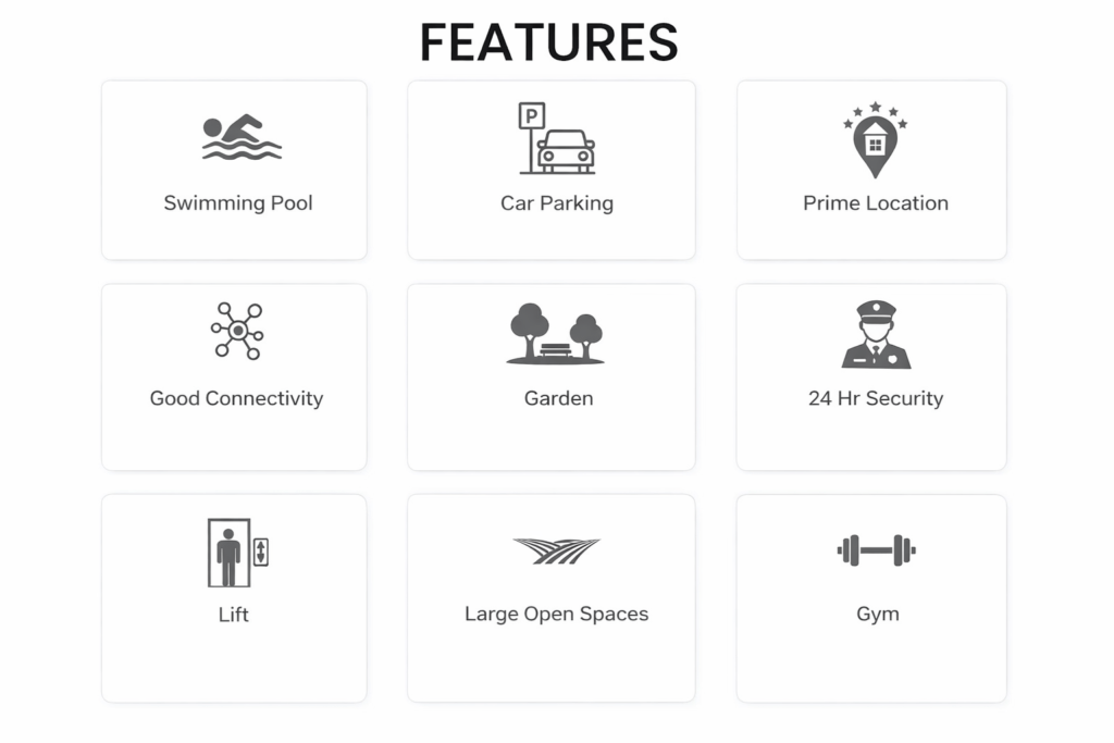 - Convenience Add-ons: Two premium lifts per tower, basement parking, and intercom systems.